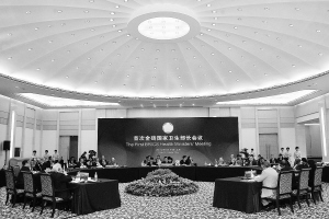 7月11日,首次金砖国家卫生部长会议在北京召开。会议围绕如何加强公共卫生合作等问题进行了讨论,并发表了《首次金砖国家卫生部长会议北京宣言》。 这是首次金砖国家卫生部长会议会场(7月11日摄)。 新华社记者 何俊昌 摄