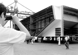 7月11日,参观者正在拍摄美国旧金山-奥克兰海湾大桥大型钢结构。 当日,由上海振华重工(集团)建造的美国旧金山-奥克兰海湾大桥全部钢结构在上海长兴岛成功交付。新海湾大桥是世界第一大单塔自锚抗震悬索钢结构桥梁,大桥主航道桥跨径为565米,钢塔总高约160米,能确保每天30万辆汽车通过,是世界桥梁通过能力之首。振华重工承建的是新海湾大桥的钢桥、钢塔、浮吊等,总标的额超过3.5亿美元。 新华社记者 陈飞 摄