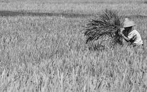 海口市农民在稻田中劳作(6月26日摄)。 7月11日,国家统计局发布公告,2011年全国夏粮总产量为12627万吨,比上年增加312万吨,增产2.5%。我国夏粮已经实现了连续八年丰收。 新华社记者 侯建森 摄