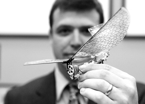 7月11日,在美国俄亥俄州赖特·帕特森空军基地实验室,微型飞行器(MAV)研制小组组长帕克正在展示一架微型扑翼飞行器。 美国空军MAV小组致力于开发微型军用飞行器,以应对复杂的城市作战环境。 新华社/路透