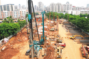 由于侨中路建设需经过华侨中学,因此,该路中段选择了下挖隧道方式,即打桩到地下后,再从地上盖板,将顶部封闭,然后在封闭的顶盖下进行施工。