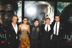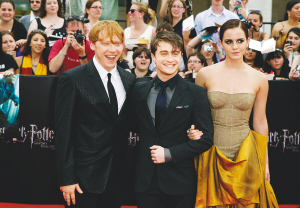 哈利·波特系列影片的三位主演———丹尼尔·拉德克利夫(饰演哈利)、埃玛·沃森(饰演赫敏)以及鲁珀特·格林特(饰演罗恩)在红地毯上华丽亮相,向观众挥手致意。
