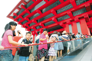 7月12日,观众沿自动扶梯而上进入中国馆参观。
