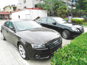 | 在泗洪县一宾馆停车场拍到的豪车。 新华社发 |