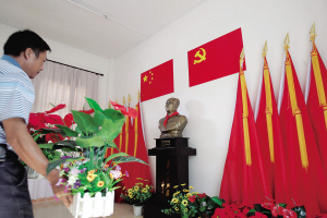 7月13日上午,在儋州市南丰镇武教村党支部办公室,支部书记正在将鲜花摆放到鲜红的国旗和党旗下。为了加强基层党组织建设,儋州市加大硬件投入,在全市283个村(社区)的党支部办公室里按照“两面旗帜、八项制度、一个公开栏、一个管理办法”统一标准进行布置安排。 本报记者 张杰 摄