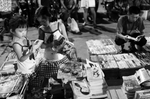 | 7月7日晚,俩女孩在夜市二手书摊看书。 本版照片均由本报记者张杰摄 |