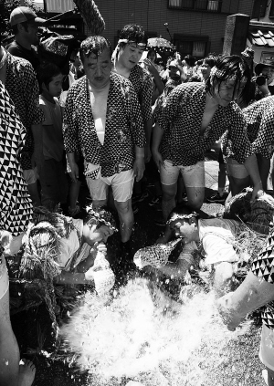 7月14日,“水止舞”祭祀活动在东京大田区严正寺举行。 该祭祀活动起源于镰仓时代,每年雨季为祈求降雨停止而举行,现已成为东京最具特色的祭祀活动之一。参加活动的人用装米的草袋裹在男人身上,旁人向他泼水,装在草袋内的人则吹响海螺。 新华社发(关贤一郎摄)