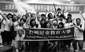 7月14日下午,全国台联2011年台胞青年千人夏令营海南分营在海南大学开营。台湾屏东教育大学的30名师生参加海南分营活动,他们将通过与海南大学师生交流、参观景点、走访台资企业等一系列活动,感受两岸文化渊源。据了解,本次夏令营的主题是“龙脉相传,青春中华”。 本报记者 古 月 摄