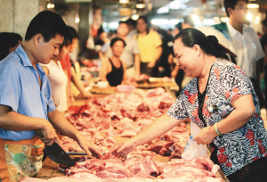 | 7月15日,三亚开始销售限价猪肉第一天,市民在第一农贸市场选购限价猪肉。 本报记者 李英挺 摄 |