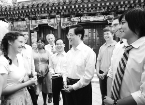 | 7月15日,胡锦涛主席在瀛台湛虚楼前同佩顿中学学生们谈笑风生,了解他们在中国的见闻和感受。 新华社发 |