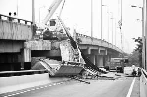 一重型车坠落 7月15日凌晨,杭州第三钱塘江大桥南端桥面出现部分塌落,一辆重型半挂车从桥面坠落,又将下匝道砸塌。司机跳车受伤,送往医院救治。记者从杭州市政府举行的新闻发布会上获悉,肇事车辆涉嫌严重超载。 新华社发