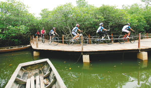 7月17日,在文昌市环八门湾绿道,来自海口的市民在悠闲骑行。 文昌市打造的环八门湾绿道自建成开放后,吸引了众多外地市民前往体验骑行的乐趣。 本报记者 宋国强 摄
