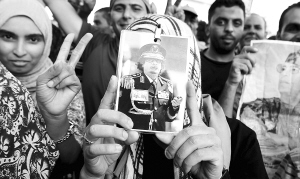| 7月16日,在利比亚首都的黎波里以西大约50公里的扎维耶,一名卡扎菲支持者手持卡扎菲照片参加集会。 新华社/法新 |