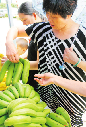7月17日,三亚市免税商店外的“爱心香蕉”销售点,外地游客在挑选“爱心香蕉”。 自从香蕉价低滞销以来,三亚市政府向全市各机关、企事业单位、宾馆酒店、社区等发出倡议:为帮助蕉农渡过难关,请大家购买“爱心香蕉”。三亚还在有条件的场所设置“爱心香蕉”销售点,拓宽销售渠道。 本报记者 李英挺 摄