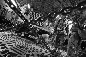 7月17日,在阿富汗南部的坎大哈军事基地,加拿大空军士兵在检查加拿大空军C-17运输机上运载的装甲车是否固定妥当。 加拿大定于7日正式结束在阿富汗的作战行动,接近3000名士兵中大多数将撤离阿富汗。加拿大2002年初首次向阿富汗派兵,部队主要驻扎坎大哈省。9年间,157名士兵死亡,驻军费用超过110亿美元。 新华社/法新