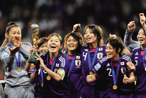北京时间7月18日,2011年德国女足世界杯决赛美国队对日本队的比赛在法兰克福落幕。日本队在点球大战中击败两届世界冠军美国队,夺得冠军。图为日本队队长泽穗希举起冠军奖杯,与队友庆祝。 新华社发