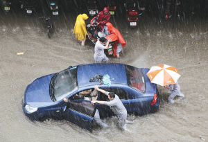 7月18日,南京市民冒雨转移被淹的车辆。 当日,一场暴雨突袭南京,造成市区部分地段受淹,给人们的生活带来影响。 新华社发(李文宝 摄)