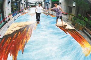 近日,亮相福州金融街万达广场的一巨幅3D画长50米、宽5米,视觉效果立体逼真。图为7月18日,当地市民前来参观拍照。 新华社发