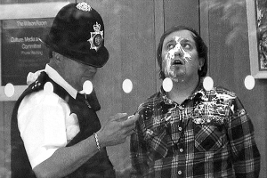 一名身穿格子花纹衬衫的男子突然出现在默多克左侧,举着盛有奶油馅饼的盘子砸向默多克。