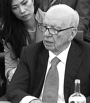 | 7月19日,传媒大亨默多克(前)和妻子邓文迪出席英国伦敦议会下院听证会。新华社/路透 |