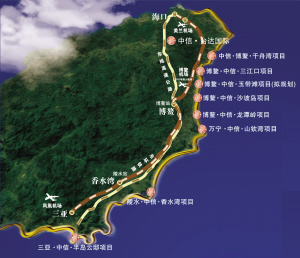 中信海南公司以海南建设国际旅游岛为契机,沿海南东部黄金海岸进行项目布局,环绕三个机场、两条高速,分别在海口、博鳌、香水湾、三亚等区域进行项目开发。从中信台达国际、中信三江口、中信千舟湾、中信龙檀岭、中信香水湾、中信半岛云邸,由北至南形成了海南东海岸整体开发的宏伟布局,业态丰富,涵盖了别墅、公寓、商业、高尔夫、游艇等。同时整合中信旗下优质资源,实现了机场接驳、项目会所提前办理登机、中信VIP候机厅直接进入安检、高铁接送、高尔夫畅打、温泉SPA疗养、游艇码头、超五星级酒店等,打造了集养生、休闲、度假为一体的中信一站式便捷生活平台。