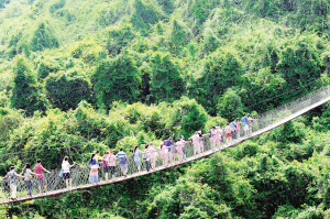 | 游客在三亚亚龙湾热带天堂森林公园悬空索桥上体验热带雨林山涧之美。 本报记者 苏建强 摄
