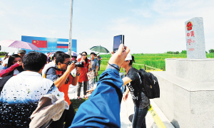←7月20日,游客在中俄黑瞎子岛交接纪念地的界碑旁拍照。黑瞎子岛正式对游客开放,首批150名中国游客登岛,领略了“一岛两国”、“原生态湿地”、中俄国界东段界桩揭幕仪式原址和界碑等独具特色的景观。
