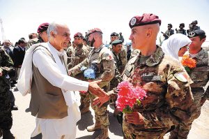 7月21日,在阿富汗西部城市赫拉特,负责安全防务移交的阿富汗官员艾哈迈德扎伊(前左)在防务交接仪式上与意大利士兵握手。 阿富汗国家安全部队21日上午在西部城市赫拉特举行防务交接仪式,开始从北约驻阿国际安全援助部队手中接管这一地区的安全防务。 新华社发(萨达尔摄)