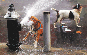 7月21日,在美国纽约曼哈顿上城,两只狗在一处消防栓前嬉水冲凉。 连日来,热浪侵袭美国大部分地区,截至20日已导致至少22人死亡。新华社/路透