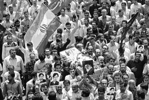 | 7月24日,在伊朗首都德黑兰,人们参加被暗杀的核物理学家大流士·礼萨伊的葬礼。 新华社发 |