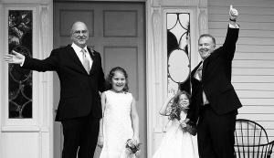 纽约市议会消费者事务委员会委员明茨(左)与市长首席顾问范恩布莱特(右)带着女儿,向参加他们婚礼的亲友挥手致意。