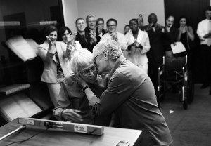 ←77岁的西格尔(右)在结婚誓词仪式后亲吻85岁的爱人。