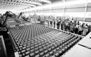 | 7月23日上午,职工代表在澄迈老城经济开发区的中航特玻有限公司玻璃生产车间参观。 本报记者 张杰 摄
