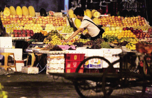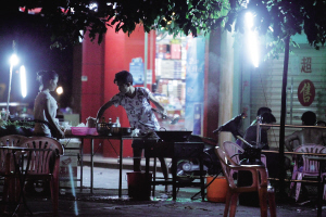 | 凌晨,海口街头的水果商贩。 本版照片均由本报记者张杰摄 |