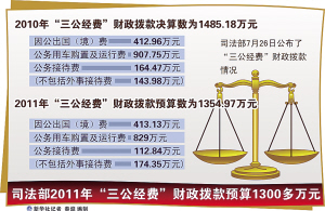 公务接待费方面,公安部2010年公务接待费支出2371.01万元,2011年预算2155.42万元,与2010年支出相比减少9%。