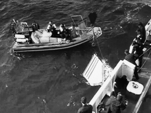7月28日,在韩国南部济州岛附近海域,韩国济州海岸警卫队队员打捞一架坠毁的货物运输机残骸。 当日,韩国韩亚航空公司一架波音747型货物运输机在南部济州岛附近海域坠毁。 新华社/韩联社