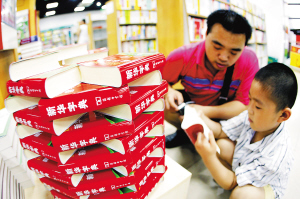 | 图为7月2日,新版《新华字典》在济南市泉城路新华书店发行,一名家长陪着孩子选购新版《新华字典》。 新华社发 |