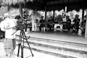 7月26日至28日,南方卫视《潮流假期》栏目组走进海南呀诺达雨林拍摄旅游专题片,向观众全方位展示呀诺达热带雨林的神奇与魅力。图为栏目组拍摄黎族八音表演。 特约记者 黄青文 通讯员 马磊斌 摄
