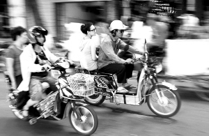 | ←7月28日下午,在海口市东湖边,一位男子用电动车载人穿行在街头。随着摩的被禁,电动车成为很多摩的司机新的选择。 本报记者 张杰 摄 |