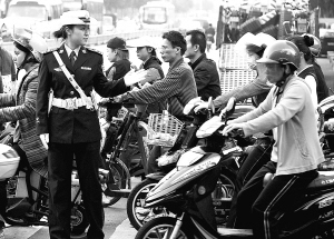 | ↑日益增长的电动自行车给城市交通带来极大压力。图为2009年12月24日,海口市交警在龙华路指挥电动自行车有序通过。