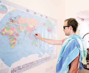 | 7月28日,三亚市大东海景区的“BULE SKY”国际青年旅社,来自荷兰的小伙子翊徽在地图上找出自己游玩过的地方。
