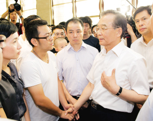 | 七月二十八日,温家宝在金球国豪酒店看望部分死伤人员家属。