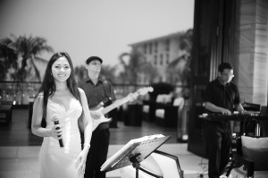 太阳下山了,Jennifer就准时出现在海棠湾希尔顿逸林酒店的大堂吧。这位身材极好的菲律宾女孩,是“UNAVEZ”乐队的主唱。与她一起合作的还有三位伙伴:吉他手Raymond Simian、键盘手Dennis zoleta、鼓手Eugene Sam。他们都是菲律宾人,都爱好音乐,就在三亚组了一支乐队。