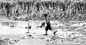 | ↓ 7月31日,内蒙古通辽市开鲁县的一位农民跨过积水查看自家受灾的农田。