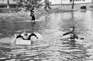 7月30日下午,两名少年在被雨水淹没的塔林市街区划着“木抽屉”玩耍。 当日上午,爱沙尼亚首都塔林突降骤雨,雨量达80毫米,创当月降水量新高。 新华社发(维克托摄)