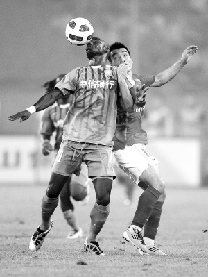 | 1日,在中超联赛中,北京队主场以1比1战平广州队。图为北京队球员凯塔(左)在比赛中争顶。 新华社发 |