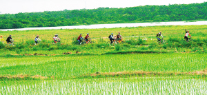 近日,一群车友在海口市琼山区新坡镇下市村田野间骑行,在享受自然中强身健体。随着人们生活水平的提高,越来越多的城市人在节假日里选择骑自行车远行。 本报记者 古月 摄