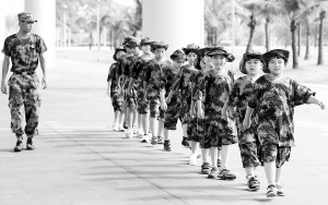 8月1日,“八一”建军节当天,在海口市世纪大桥底下的省爱国拥军促进会国防教育基地,一队“童子军”正在教官的严格训练下体验军营生活。据了解,这是该基地举办的暑期军事拓展夏令营活动,旨在通过军训等方式,普及国防教育,培养孩子们的组织纪律性。 本报记者 张杰 摄