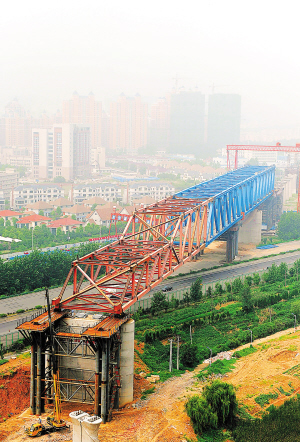 采用了大量新工艺的京福高铁合肥南环线钢桁梁柔性拱特大桥工程在保证质量的前提下稳步推进(8月1日摄)。 为了落实国务院提出的进一步强化安全生产管理制度,担负着北京到福州高速铁路合肥南环线施工任务的中国中铁四局钢结构公司,针对国家重点工程所采用大量新生产技术和流程,认真排查施工中可能存在的安全隐患,对所运用新工艺新材料进行反复论证,改变过去计划工期施工模式,坚持质量安全第一,在合理工期安全生产的前提下完成国家重点工程建设。 新华社记者 王雷 摄