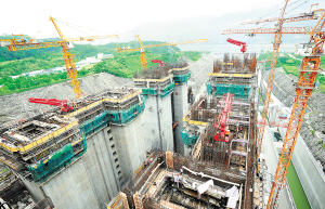 8月1日,工人在三峡升船机建设工地施工。 日前,被称为三峡工程“谜底”的三峡升船机筒体浇筑高程已突破170米,距离196米平台及横向联系结构高程仅剩24.35米。三峡升船机是三峡双线五级船闸之外的一条快速通道,预计2015年正式投入运行。届时,3000吨级的中小型客货轮或特种船舶能乘此“电梯”短时内垂直升至百米以上的上游水道,三峡船闸通航效率将因此提高。 新华社发